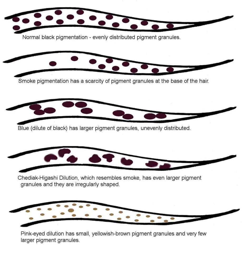 Легендарное серебристое сияние шерсти русской голубой создаётся рецессивным геном разбавления (d), который влияет на то, как гранулы пигмента распределяются внутри каждого волоса. У чёрного окраса пигментные гранулы отделены друг от друга и равномерно распределены, придавая шерсти насыщенный глянцевый цвет. Ген разбавления же заставляет гранулы слипаться и распределяться неравномерно, из-за чего цвет выглядит светлее, а шерсть приобретает мягкий голубой оттенок. Это хорошо иллюстрирует упрощенная схема гранул пигмента в кошачьей шерсти — на основе фотографий, полученных в ходе микроскопического исследования (источник).