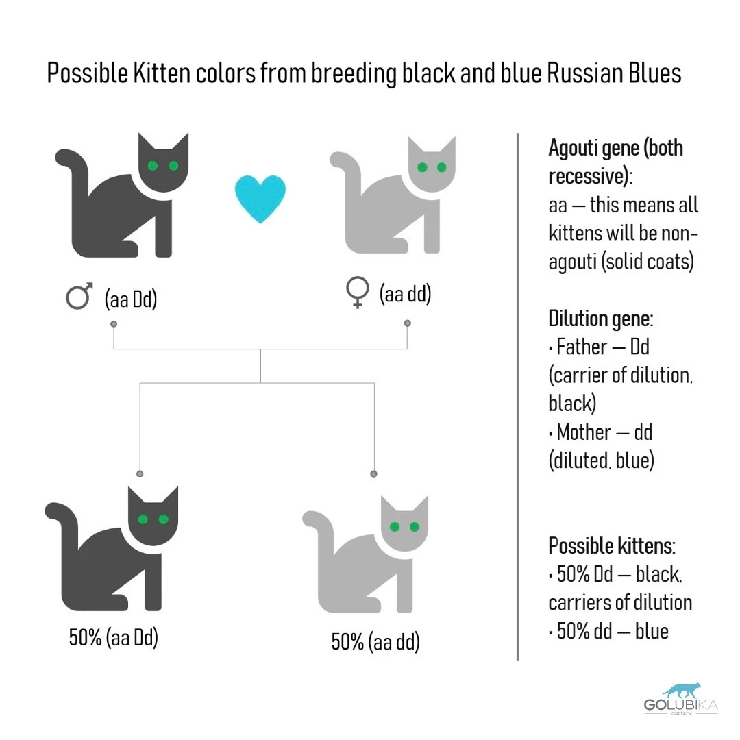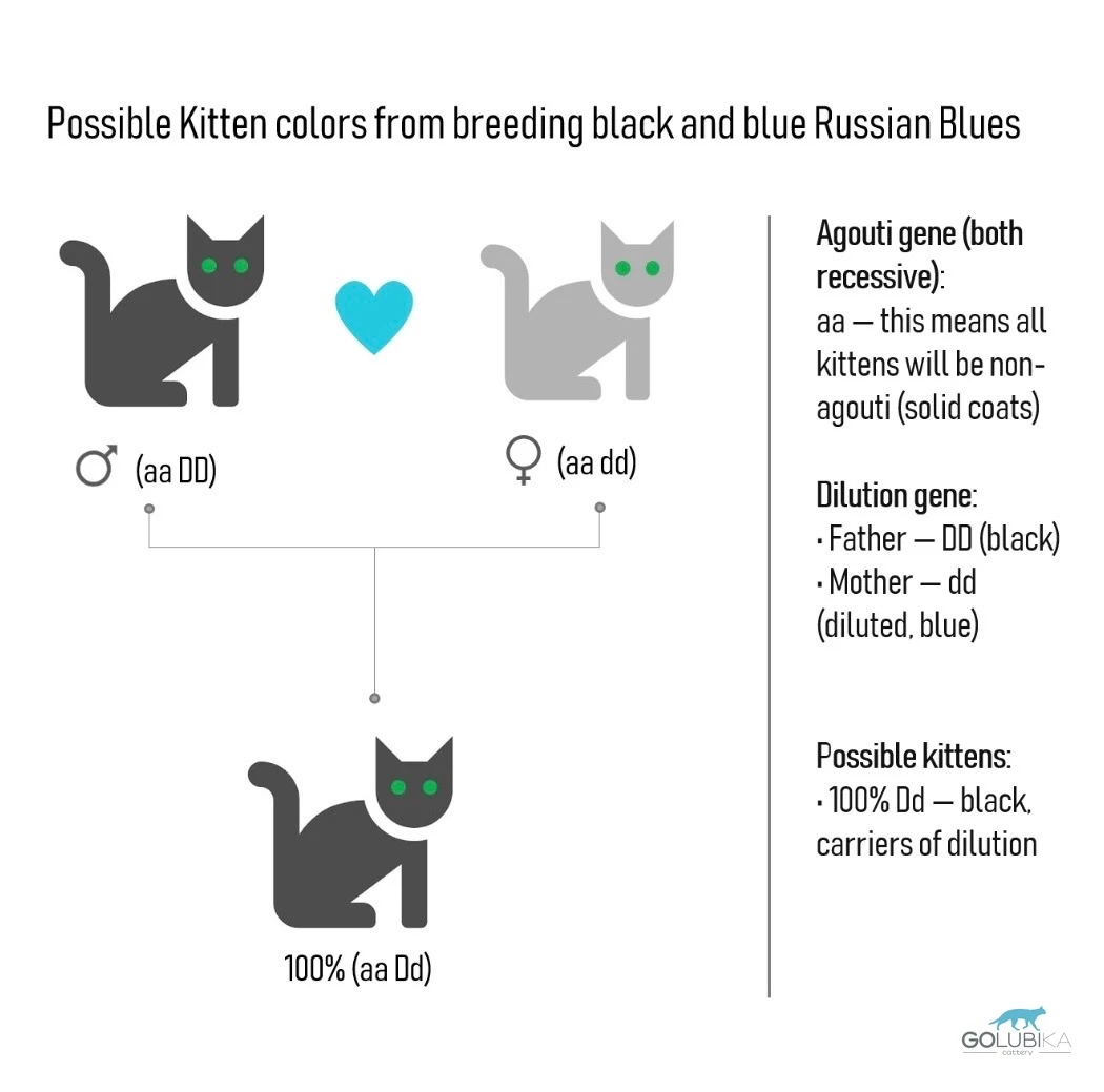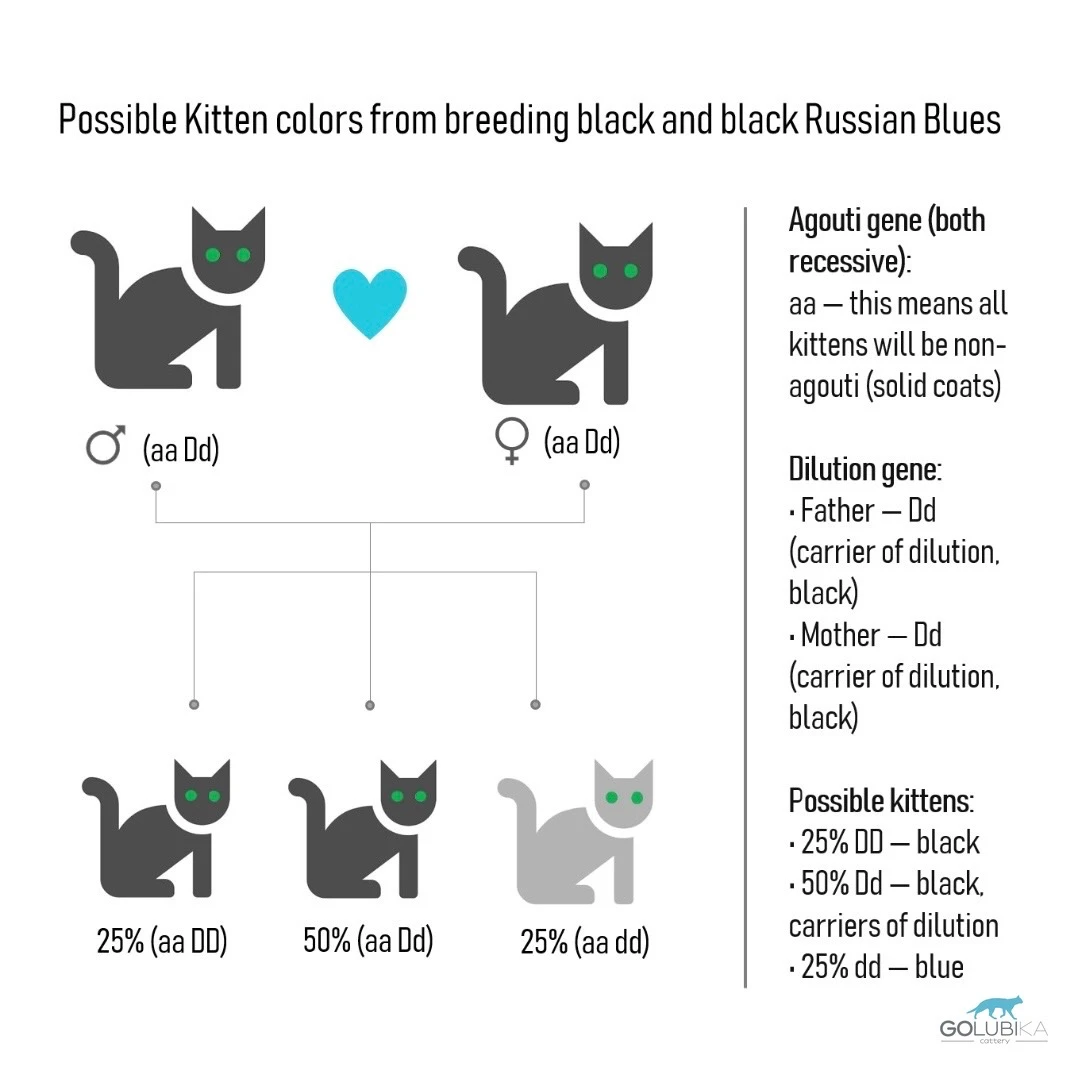 Если же русская черная является гомозиготной по разбавлению (DD), то в паре с голубой кошкой (dd) все котята будут черные и гетерозиготные по разбавлению (Dd).